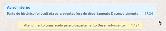 Por exemplo, se o atendimento começou no comercial, qualquer atendente do comercial consegue ver as mensagens daquele trecho. Mas ao transferir para o time técnico com o histórico oculto, os agentes do técnico não terão acesso às mensagens anteriores.